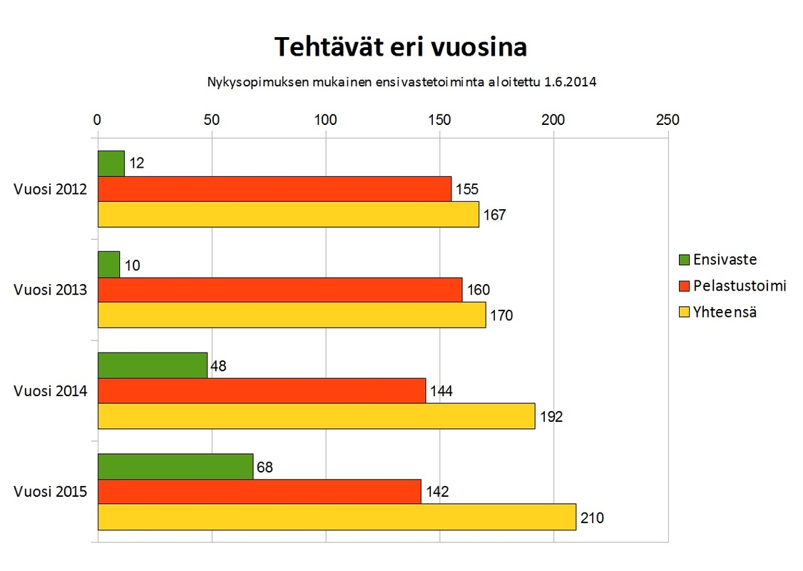 - Ensivastetehtävät lisääntyivät huomattavasti vuonna 2014. Tämän selittää 06/2014 solmittu ensivastesopimus pelastuslaitoksen kanssa.